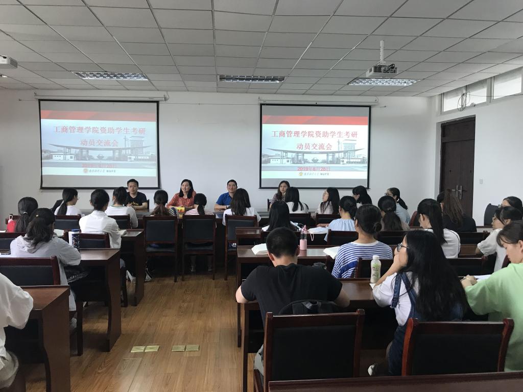 资助学生考研动员交流会。学院党委副书记杨华、学工办主任兼2018级辅导员邱祥霞、2016级辅导员聂志平、2017级辅导员赵菲以及全体有考研意向的受资助学生共49人参加交流会。