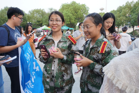 下午五点,同学们在我校仙林校区西苑第七学生餐厅门口,将亲手制作的月饼发放给刚刚结束军训的新生们。得到消息的新生们三两成群,来到派发现场,在志愿者们的引导下挑选自己喜欢的月饼,并真诚地感谢学长学姐们,现场氛围其乐融融,一派和谐。