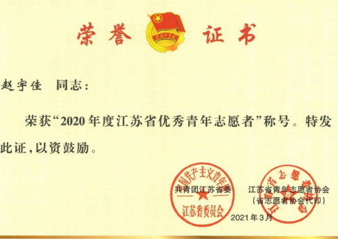 赵宇佳同学在此次评选中获评“2020年度江苏省优秀青年志愿者”。