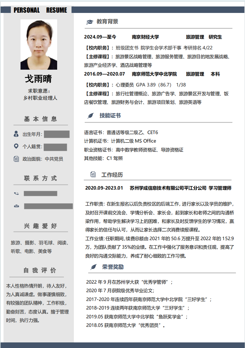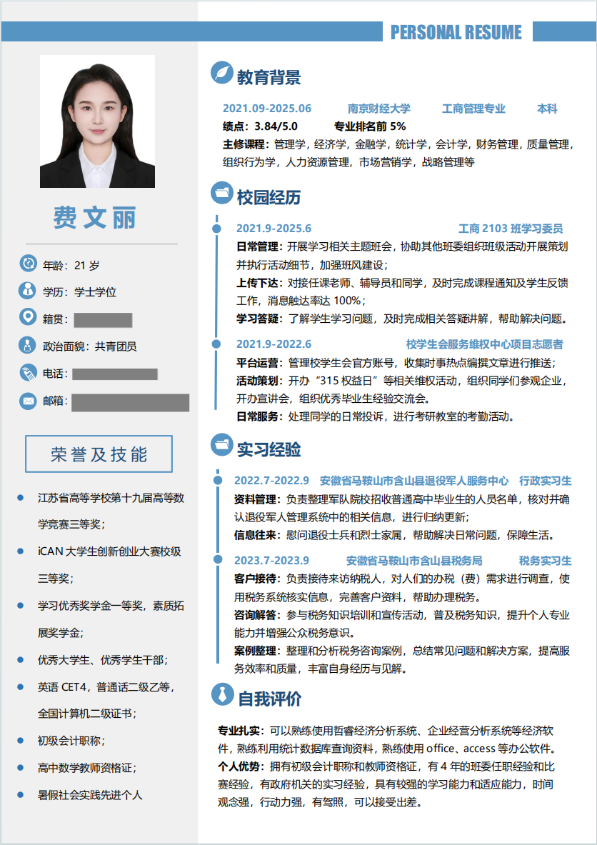 必要部分:确保简历包含个人信息、教育背景、工作经历、校园活动、荣誉奖项、技能和兴趣爱好等关键内容;
