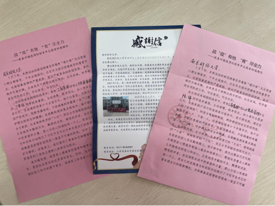 面对疫情,同学们放弃暑假,主动请缨,挺身而出,加入各地青年志愿者行列。他们中有的主动开展科普宣传、劝导没有佩戴口罩的居民,有的驻扎村口监测进出人员体温,有的进行数据录入、上报等工作,他们用实际行动温暖守护,贡献青春力量。一封封来自四面八方的感谢信,彰显着新时期我校学子的情怀与奋进,践行了青年一代的理想与担当。