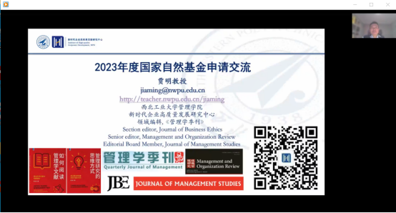 邀请,西北工业大学管理学院副院长贾明教授为学院全体师生带来一场主题为“2023年度国家自然基金申报交流”的线上学术讲座。讲座由大乐透
