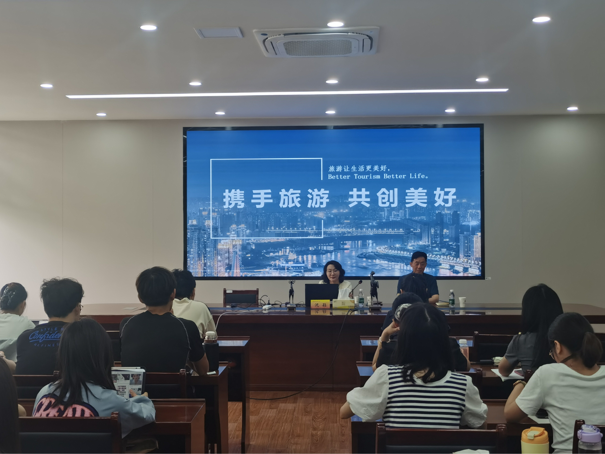 邀请,南京旅游集团商旅股份有限公司沈颖总经理在德济楼408会议室作题为“携手旅游共创美好”专题讲座。讲座由院长万绪才主持,学院旅游管理专业师生代表共同参加。