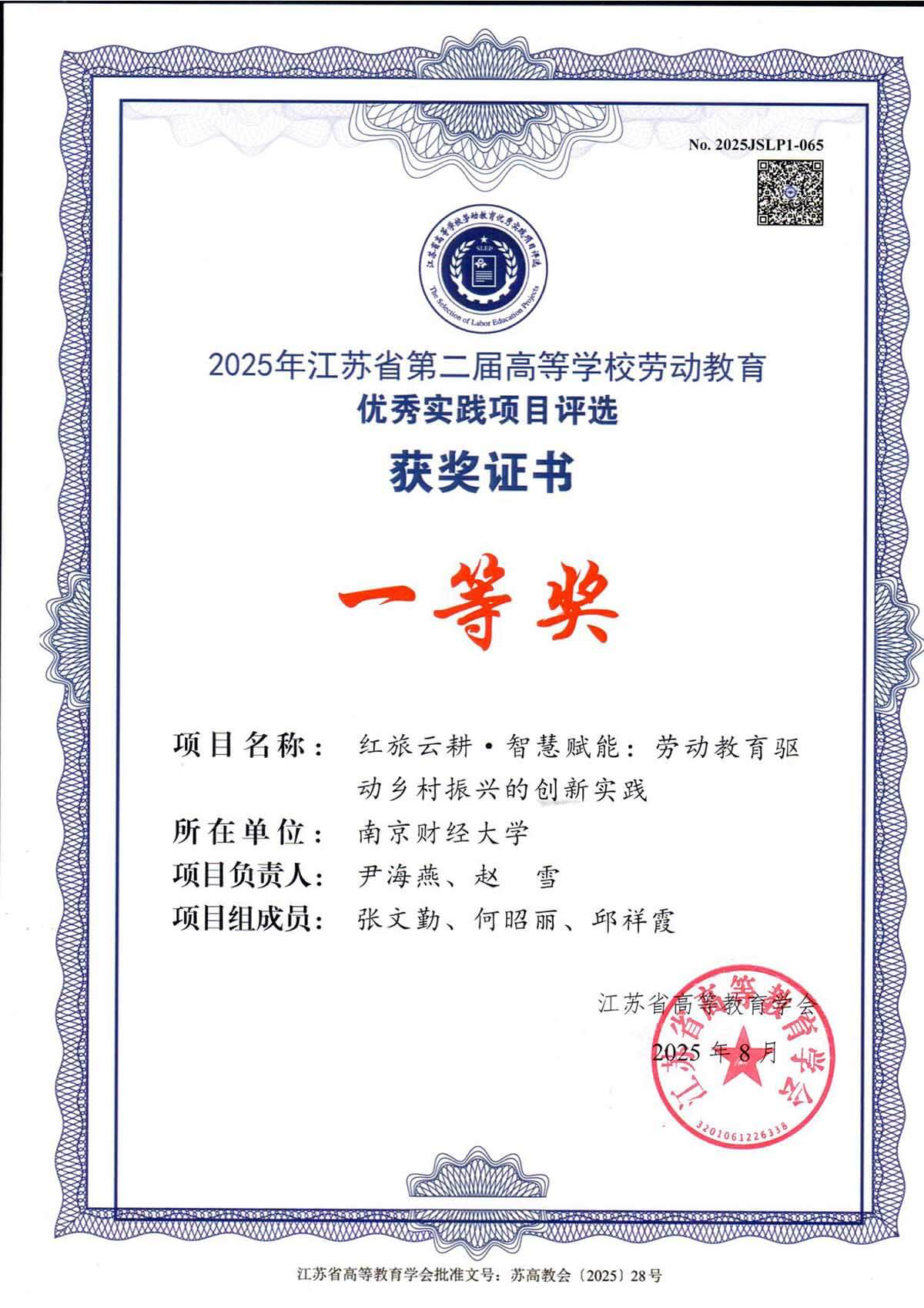 据悉,根据《关于开展2025年江苏省第二届高等学校劳动教育优秀实践项目评选工作的通知》(苏高教会〔2025〕1号)文件精神,江苏省各高校和省高教学会劳动教育研究委员会限额推荐433项,经网络评议、现场评审和社会公示,共评选出优秀实践项目369项,我校两个项目获奖。该项目旨在努力构建具有综合性、实践性、开放性、针对性的教育体系,进一步推进高校劳动教育实施,总结推广先进经验和有效做法,增强劳动教育育人实效。