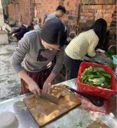 在村民的带领下,同学们领取镰刀和草帽后陆续下田,分工协作进行割稻打稻劳动。劳动过程中,同学们感慨到对“一粥一饭,当思来处不易;半丝半缕,恒念物力维艰”有了更深的体会。同学们还在地里摘取新鲜的蔬果,自主择菜、洗菜、烧饭,沉浸式体验农家生活。