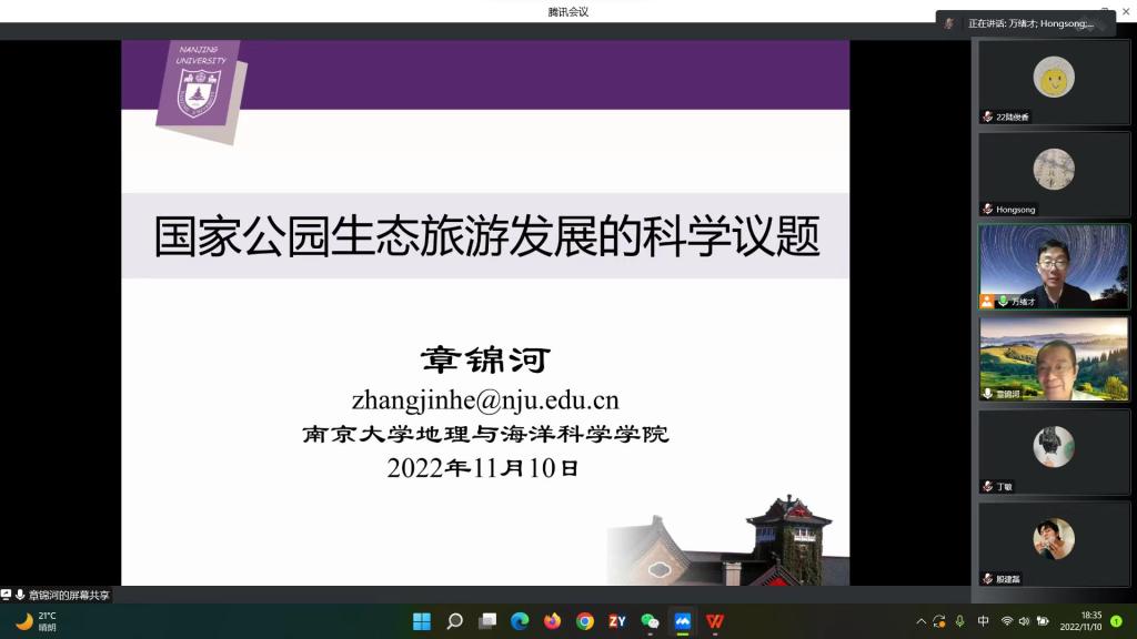 邀请,南京大学地理与海洋科学学院教授章锦河通过腾讯会议作了题为“国家公园生态旅游发展的科学议题”的讲座。讲座由大乐透